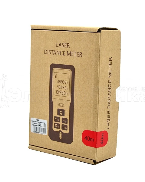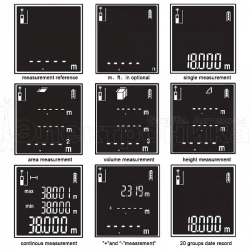 Дополнительные функции дальномера: режим непрерывного измерения, измерение максимальных и минимальных расстояний, измерение различных площадей с одним общим параметром. В памяти дальномера можно сохранять до 20 результатов измерений.