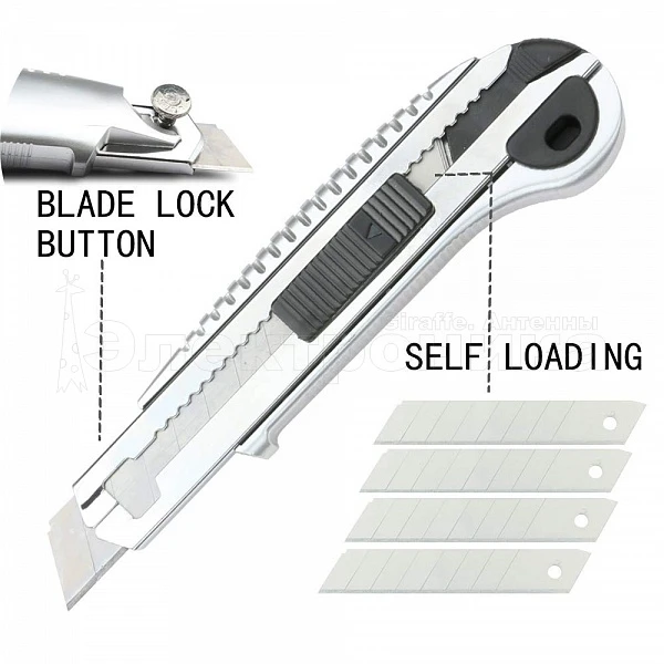 Длина: 15 см Сменное лезвие всего 5 шт в комплекте Ширина лезвия 18мм, толщина 0.5мм Ручка пластик