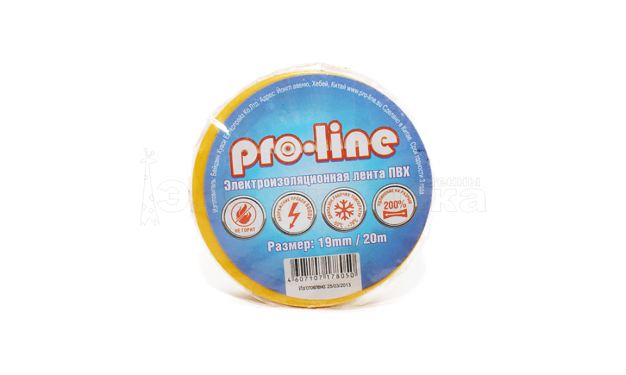 Изолента Pro Line - выбор профессионалов. Используется при электротехнических работах и служит для электроизоляции проводов и кабелей. - Самозатухающая (класс А) - Напряжение пробоя 6000 V - Диапазон рабочих температур от -50 до +70 градусов Цельсия - Удлинение на разрыв не менее 200% - Толщина ПВХ 0,15 мм - Изщоляционная лента изготовлена из ПВХ высокого качества - Адгезия 1,5 Н/см - Отлично клеится - Соответствует ГОСТ-16214-86 - Срок годности - 3 года