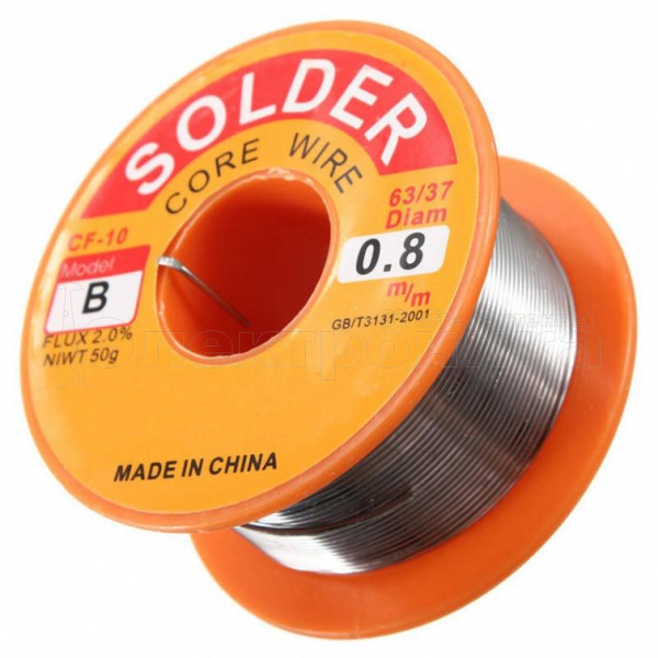 Диаметр припоя составляет 0.8 мм, вес: 50 г., температура плавления: 250 C